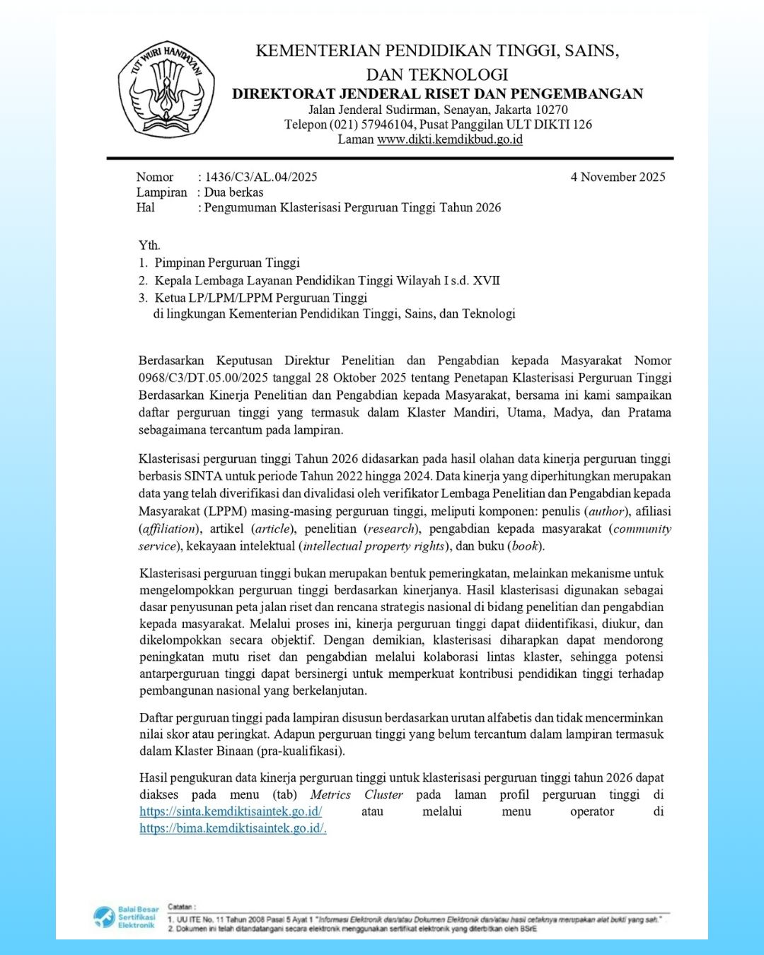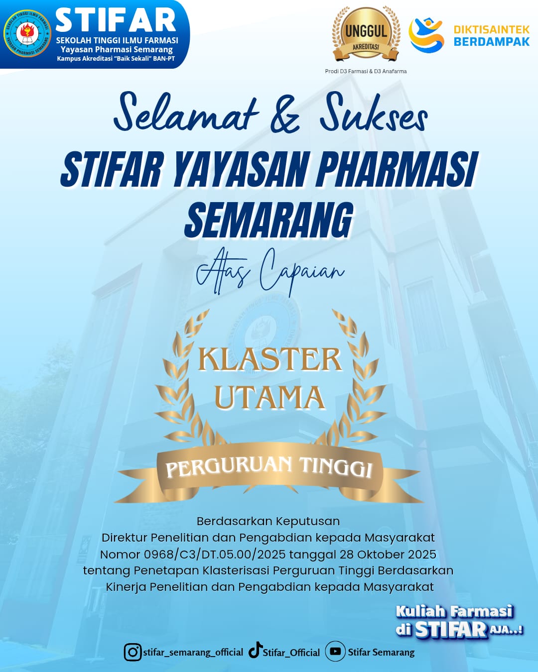 Sebagai institusi yang menjunjung tinggi nilai-nilai akademik dan pengabdian, kita memiliki tanggung jawab besar untuk terus berinovasi dan memberikan dampak positif yang berkelanjutan. Ke depan, tantangan yang kita hadapi semakin kompleks. Oleh karena itu, kita perlu terus meningkatkan kolaborasi, baik di dalam maupun di luar lembaga. Mari kita manfaatkan kesempatan ini untuk memperkuat jaringan, membangun kerjasama, dan menciptakan sinergi yang lebih kuat. Dengan demikian, kita dapat bersama-sama menjawab tantangan dan membawa lembaga kita menuju masa depan yang lebih gemilang.”